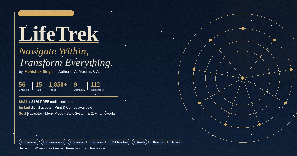 Master every domain of life—from spiritual clarity to physical vitality, mental resilience to practical mastery. 1,850+ pages of frameworks, tools, and daily practices across 56 chapters organized into 15 integrated parts.
